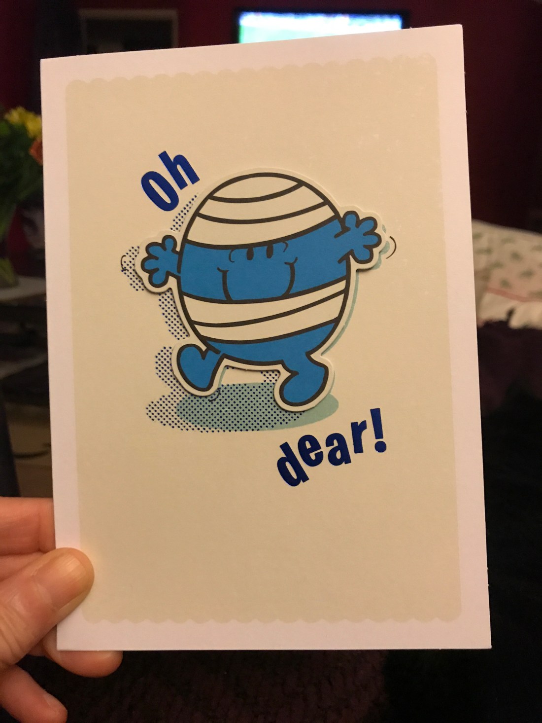But in a weird way, it’s my super power as it means I’m very good at working things out, looking at alternative ways to do something and problem solving. It also means that once I’ve grasped something I can repeat it again and again. This is massively helping me at the moment as I’m having to adapt simple tasks and working out how to get around with one leg. Made me laugh to get this card today.