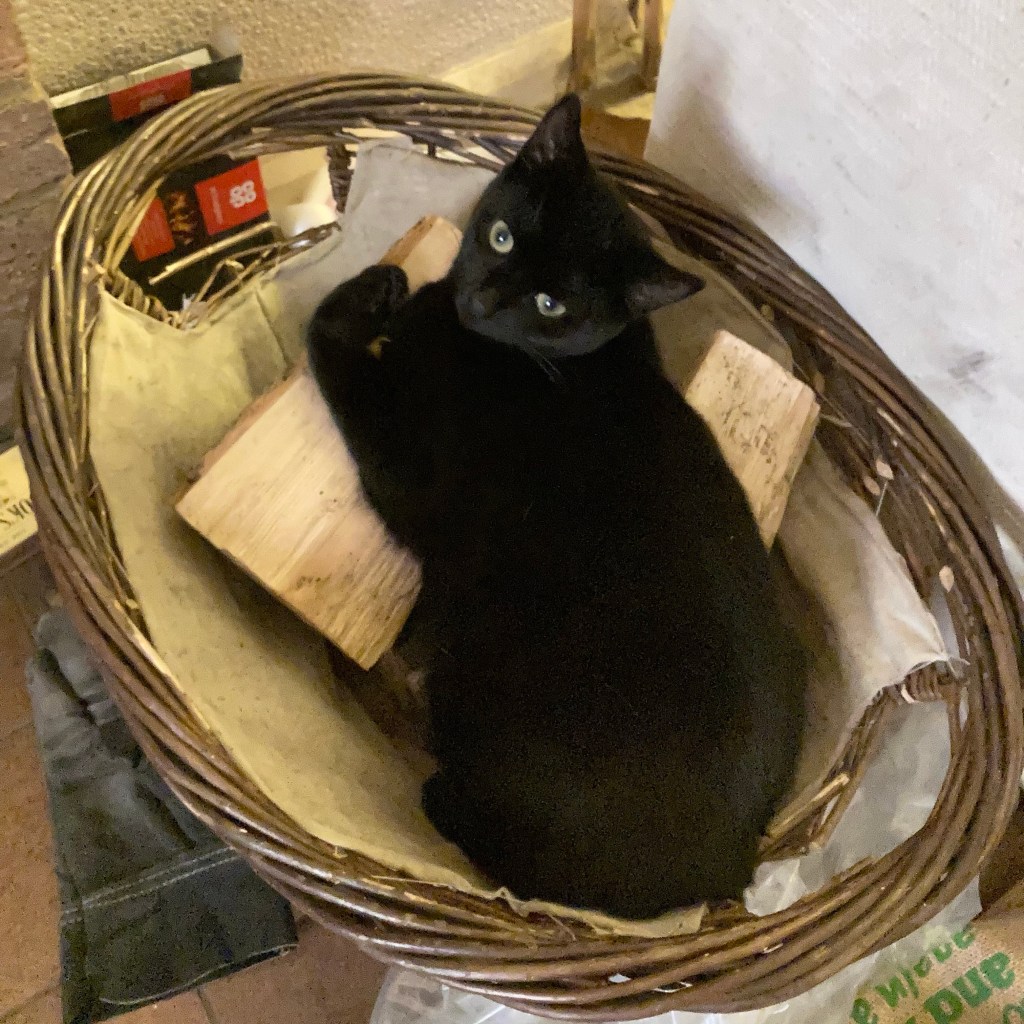Just a kitten in the log basket. That cannot be comfortable Hugo….?!