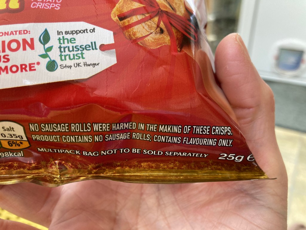 My appetite hasn’t fully come back so I’ve been struggling with eating enough. I bought some sausage roll crisps at Christmas but never got round to eating them. Spotted this small print. Made me laugh.