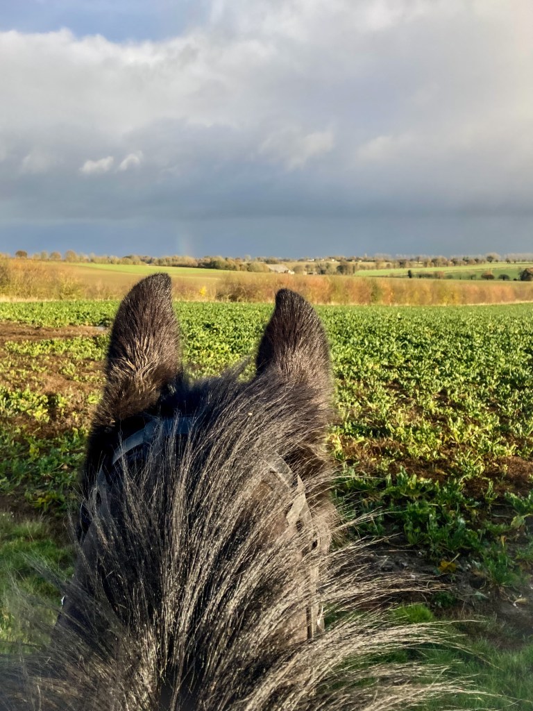 What is it they say? The sun shines on the righteous? Well I’ll take that today. After watching sideways rain most of the day, Buddy and I braved it. So glad we did. The sun shone the whole way round. We watched the clouds rolling towards us. And saw a rainbow. But made it back before the heavens opened.