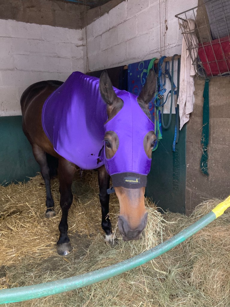 Tonight saw the return of BatBuddy. He’s thrilled as you can see. After a long hack, the bath / plait epic started. Boy am I out of practise. So they’re not my best efforts. Buddy got rather bored too. Even with food. Still it’s done now. Fingers crossed they stay in overnight.