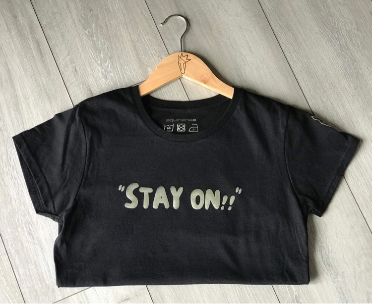 So I wrote to them after I nearly fell off in a lesson until the words ‘stay on’ came out of my mouth. After reading out my email, it was suggested that we need it on a t-shirt. And I made it happen!!