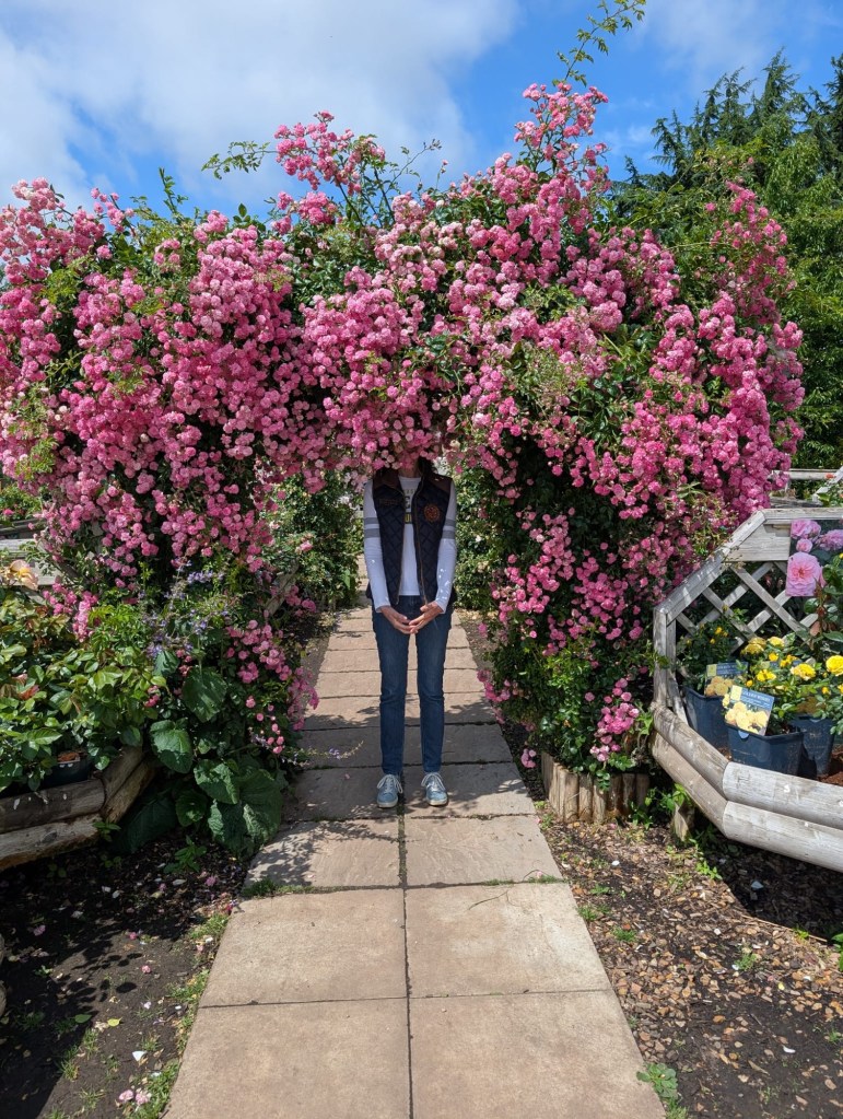 After lunch, we headed out to smell the roses. Literally. Found a few more beauties I want to buy. Go and stand under the rose arch, my friend said. Off I trotted, only to find it was designed for someone less Amazonian than me. So it looks like I’ve got a very fancy hat on. I wouldn’t look out of place at Royal Ascot (yes I know that was last week). I had to crouch down to to seen!
