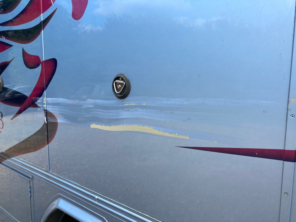 I was so busy trying not to hit the athe gate and fence post, I didn’t notice the sign sticking out. So it took some paint off. It’s cosmetic and can be fixed.