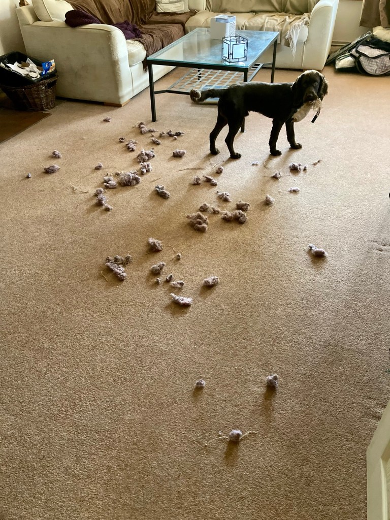 Oh dear, Bert’s toy exploded! He’s going through a rather destructive phase. Thankfully he’s attacking his toys rather than anything of mine… He’s destuffed several toys and is taking as many of his others toys into the garden as possible.