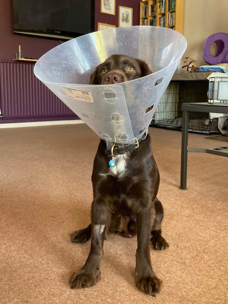 So he’s back in the crate, dragging the cone across the bars like some 50s jailhouse film. It’s going to be a long evening. Thankfully, I’ve been offered a bodysuit for him, so I’ll go and get that tomorrow.