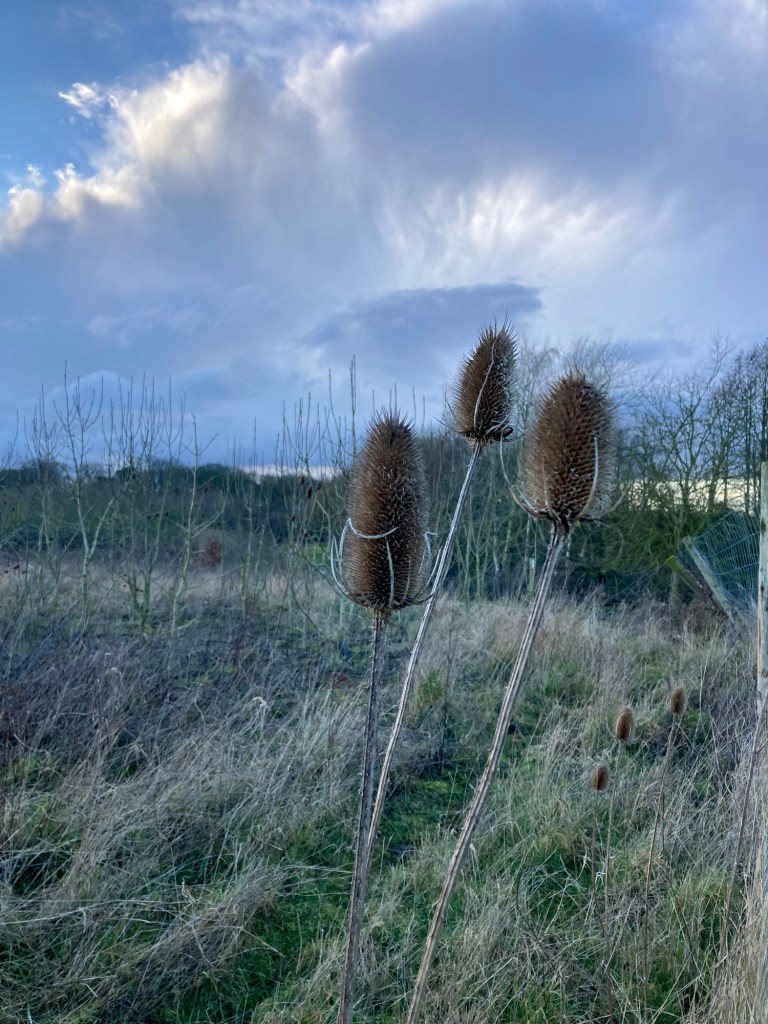 I spotted these teasels while walking Bert today. They reminded me of my Nanna and wonderful Saturday afternoon memories from my childhood. She lived in a flat in Brighton, well Hove actually (in joke there). One of her neighbours taught me how to comb wool with teasels. And spin it into yarn. Who knew I could be rather skilful with a spinning wheel. She also tried to teach me to crochet. I wasn’t very good at that! My Nanna taught me how to knit. I was OK at that. My Mum, on the other hand, was an avid knitter. The constant clacking of needles was a very familiar sound growing up.