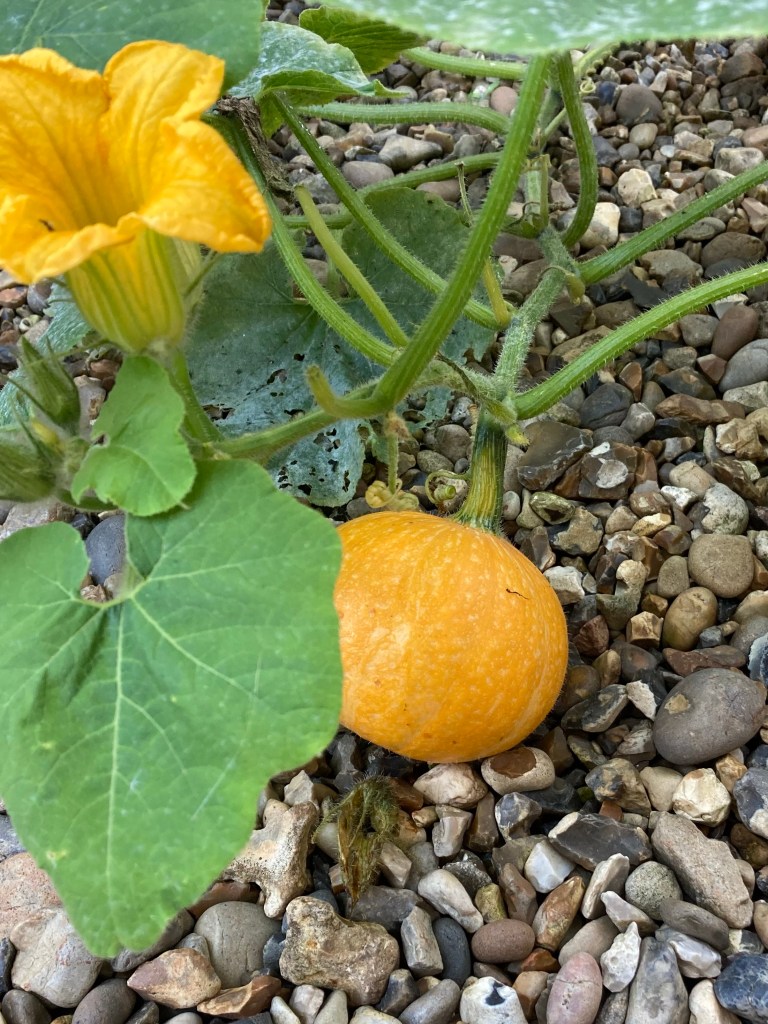 My pumpkins are excelling! And spreading all over the driveway. So far I’ve counted 6 and lots of flowers. Pumpkins make me feel very Autumnal.