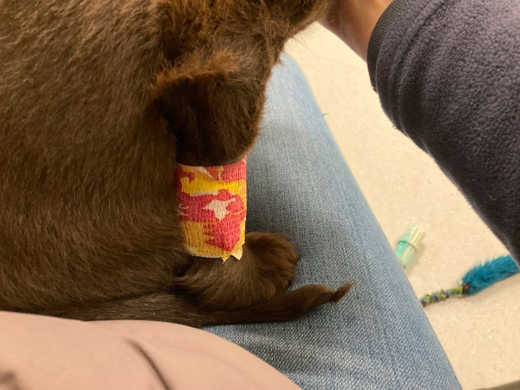 Bert had an imaginary ‘bo bo’ at Puppy Pre-School tonight. I could say that he was very brave having the bandage put on, but honestly, I’m not sure he even noticed. He was far more interested in the liver paste on the table.
